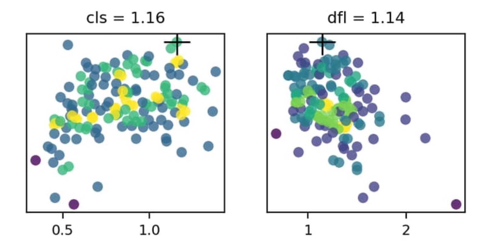 I’m quite certain the x-axis indicates the hyperparameter value and the y-axis the fitness but I can’t seem to figure out with the color indicates. There is no color scale given nor can I found information about it in the documentation.